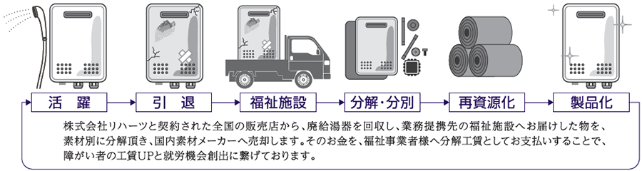 リハーツは給湯器リサイクル事業での基幹業務となる仕事を福祉事業者様に委託することで障がい者の工賃アップや、